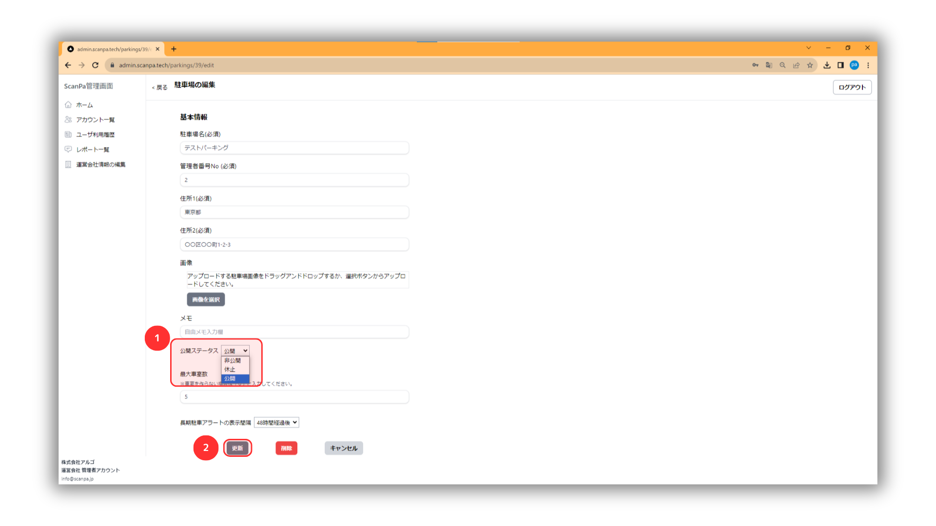駐車場詳細を編集するをクリックする。休止または非公開を選択し、公開をクリック。