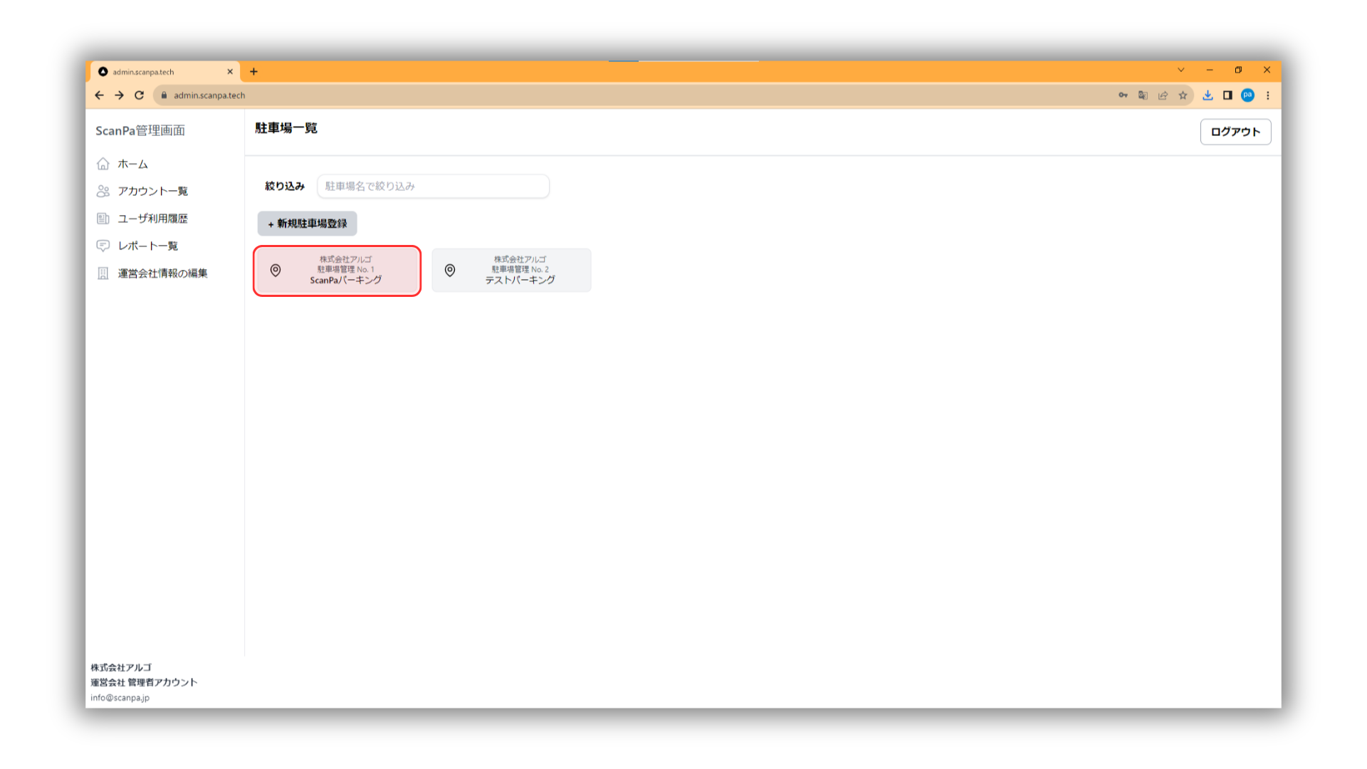 ①駐車場一覧ページより該当の駐車場をクリックする。