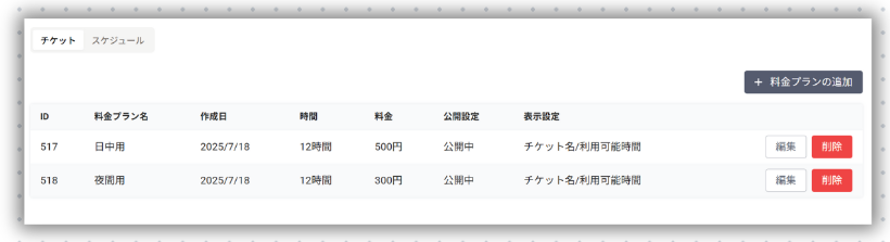 「チケット」タブで料金プランの登録を行ってからスケジュール登録をお願いします。