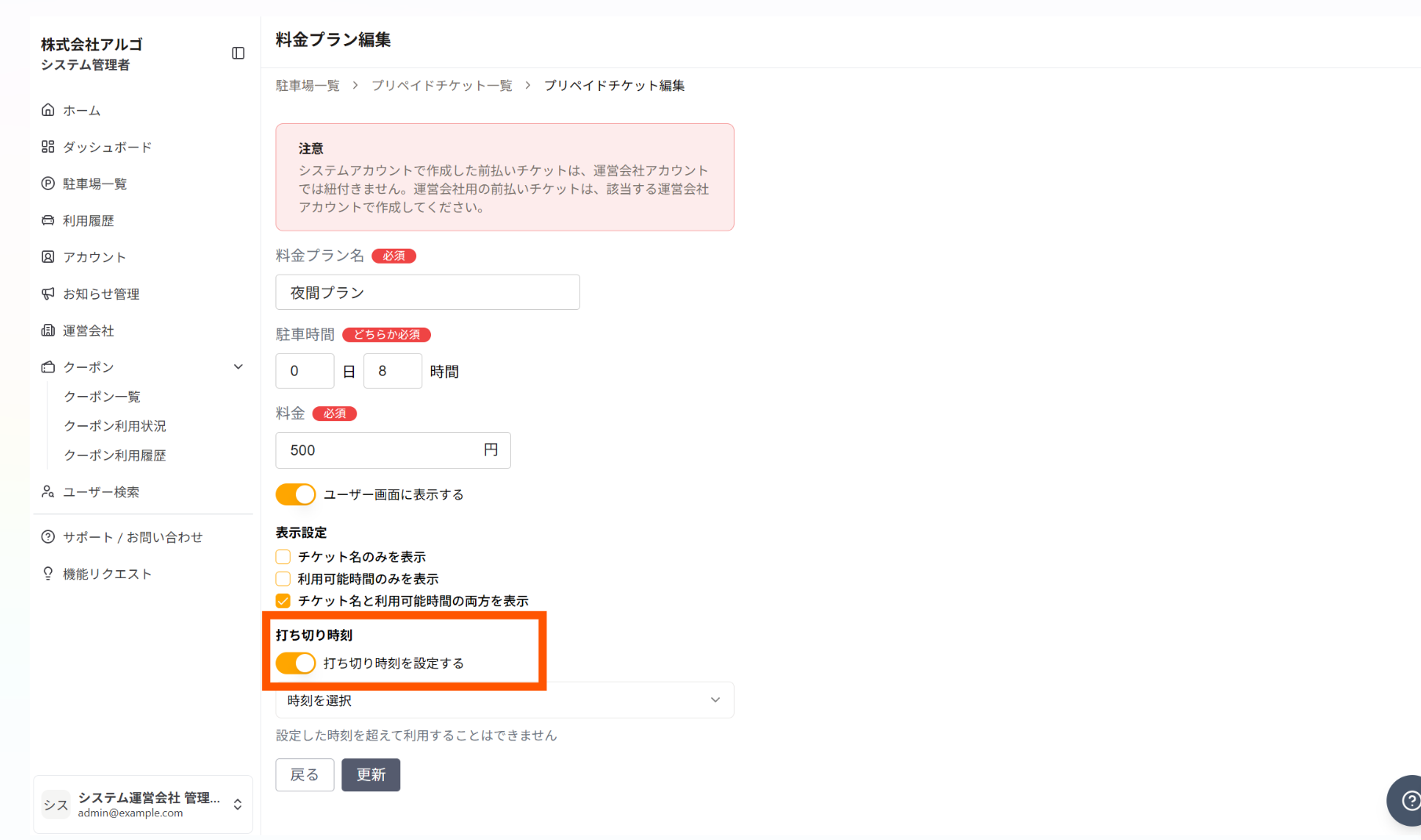 打ち切り時刻を設定すると、駐車場ユーザー様の利用可能時間に即時反映されます